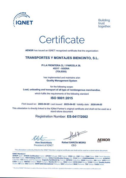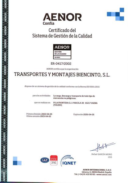 La Dirección de TRANSPORTES Y MONTAJES BIENCINTO, S.L. consciente de la importancia que la Calidad tiene en el momento actual y en el futuro, ha decidido impulsar una clara Política de Calidad en la empresa, tendente a conseguir los siguientes fines: